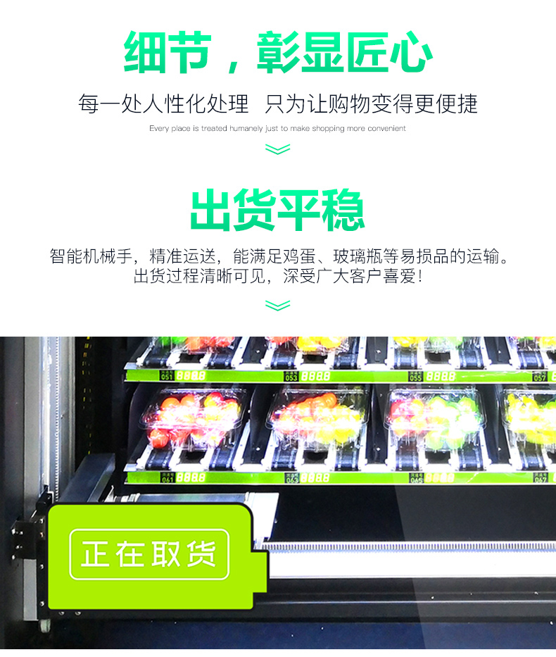 中吉11C生鲜牛奶药品易碎品中间取货售货机定制 | 全程标配光电出货检测系统,最大程度的减少卡货。升降取货,防爆、防尘、,防水夜光金属键盘。